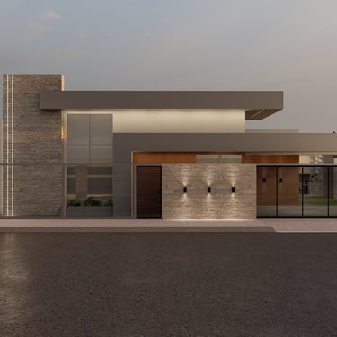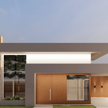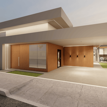 Neste projeto, o desafio principal foi o tamanho do lote, que tinha uma frente maior que a parte de fundo. O cliente tinha uma metragem específica e exigências claras para o layout: uma suíte master com closet, uma suíte de visita, um escritório, uma sala de jantar, uma sala de TV e uma cozinha ampla.